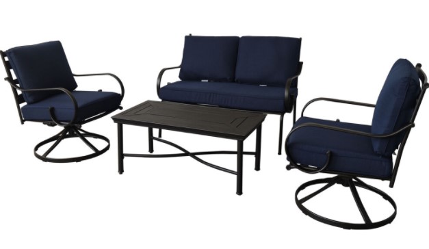 Spend more time outdoors with the Montclair 4-piece patio set from Hanover®. This chat set includes two swivel chairs, a loveseat and a matching coffee table. The sleek, modern frames are forged out of heavy-duty steel and treated with a multi-step, powder coated finish for the ultimate outdoor protection. Items within the Montclair Collection are designed to be durable, functional, and timeless. Designer details include curved backrests, elegant curling arms, and swivel-action chair bases that can sweep guests off their feet into a full 360-degree spin. The chairs and loveseat are topped with thick foam cushions that allow you to entertain your guests in fashionable comfort. The fabric is soft to the touch, yet durable enough to resist moisture, stains, and UV harm. Entertain in style and comfort all year long with the Montclair Collection.